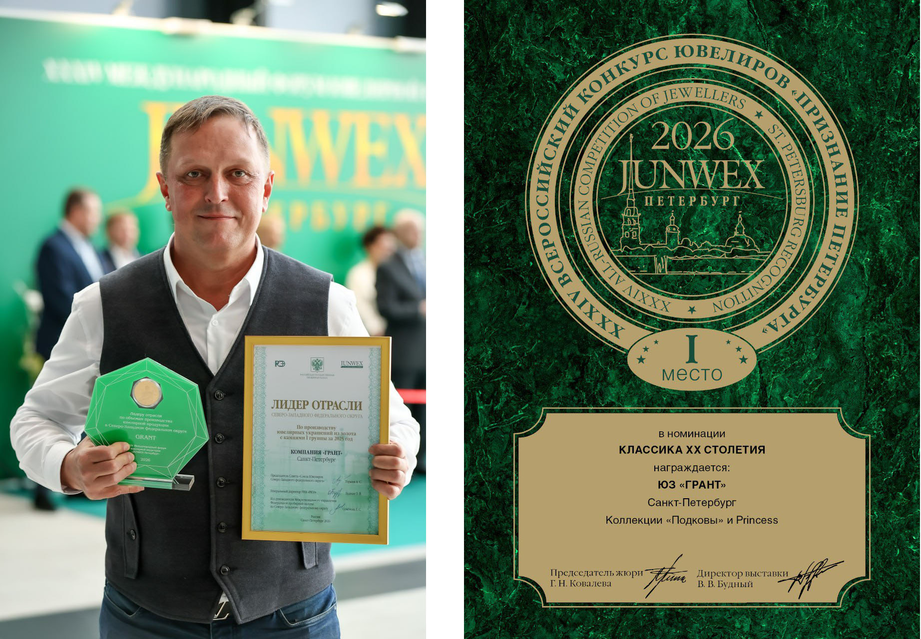 Эксперты в очередной раз отметили художественную ценность изделий завода. Сразу две коллекции GRANT «Подковы» и Princess заняли первое место во Всероссийском конкурсе ювелиров «Признание Петербурга». Члены жюри, в составе которого искусствоведы Государственного Эрмитажа и Музеев Московского Кремля, отметили качество изделий GRANT: «В представленных на конкурс коллекциях мы видим нестандартную пластику форм, точность закрепки и продуманный выбор огранки камней».