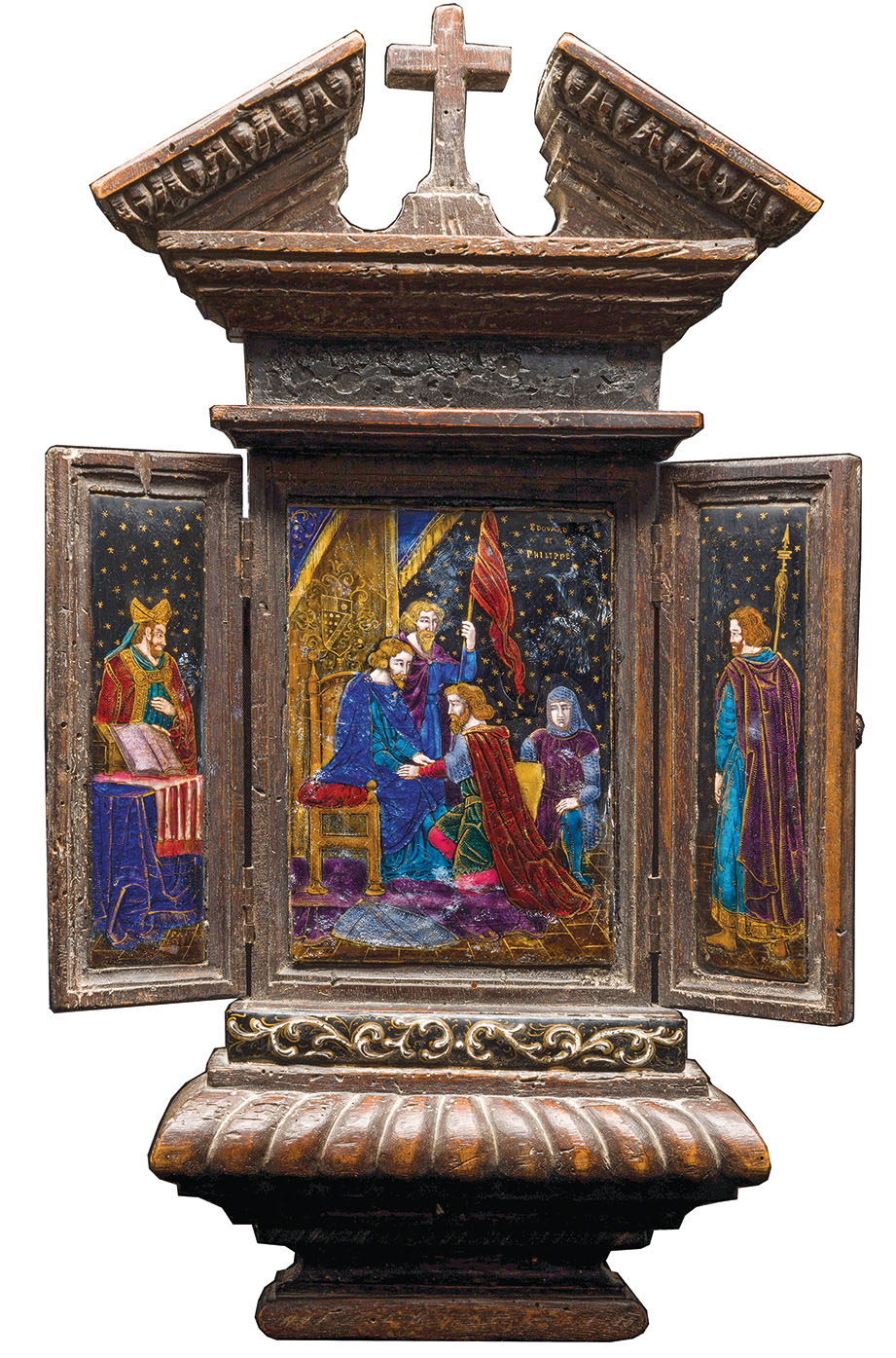 Выдающийся лиможский эмальер XVI столетия Пьер Реймон представлен на выставке уникальным произведением – триптихом "Оммаж Эдуарда Филиппу". Работа посвящена ключевому событию средневековой истории: принесению вассальной присяги английским королём Эдуардом I французскому монарху Филиппу IV Красивому в июне 1286 года, последовавшему за завершением военного конфликта между двумя державами. Триптих исполнен в технике живописной эмали и обладает безусловным атрибуционным признаком – монограммой «PR» с указанием даты «1563», что подтверждает его авторство. Творчество мастера, охватывающее период с 1537 по 1578 год, отмечено виртуозным владением различными эмальерными техниками, включая гризайль и полихромную эмаль. 1560-е годы, к которым относится данное произведение, справедливо считаются временем расцвета его искусства.