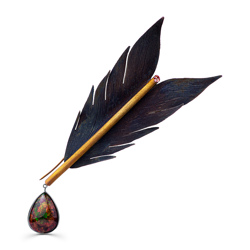 JEMAE. Брошь-заколка «Стрела, попавшая в цель». 1 опал 15,12 карат. 1 Lab Diamond розовый 0,31 карата. Титан. Вес 19,62 гр. Ручная гравировка
