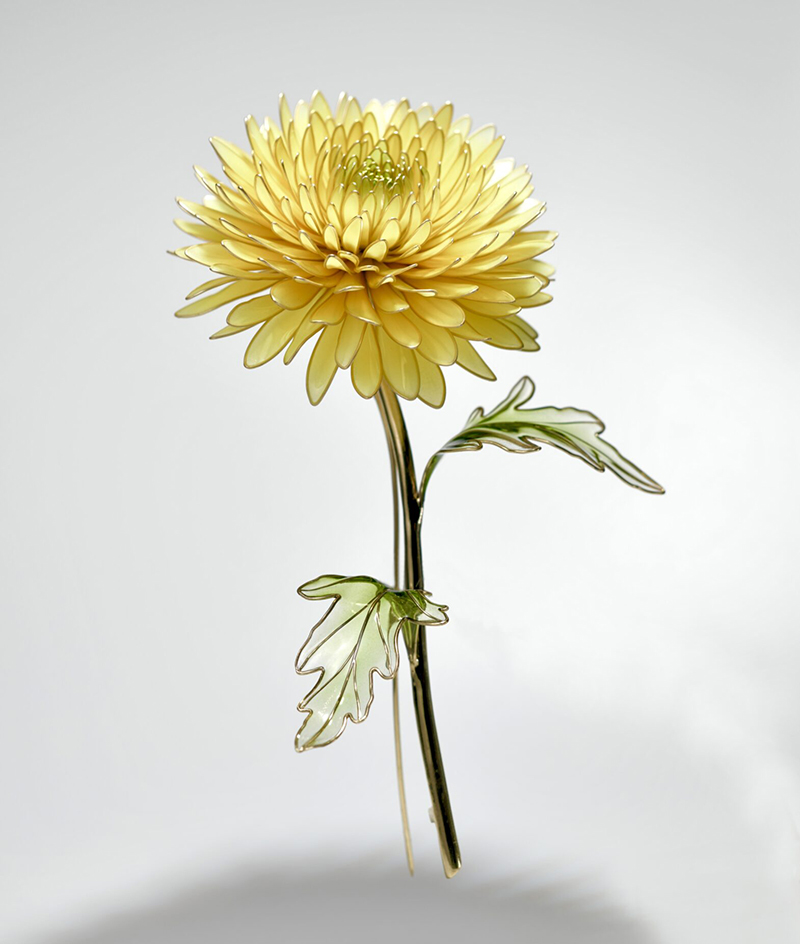 Margarita Zimina. Брошь «Хризантема». Жёлтое золото 585, бриллианты в центре цветка, сочетание авторских эмалей, золотая пыльца в листьях и лепестках