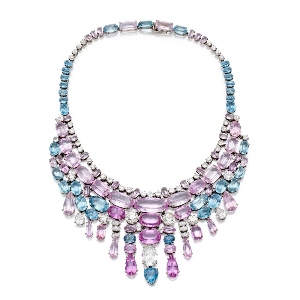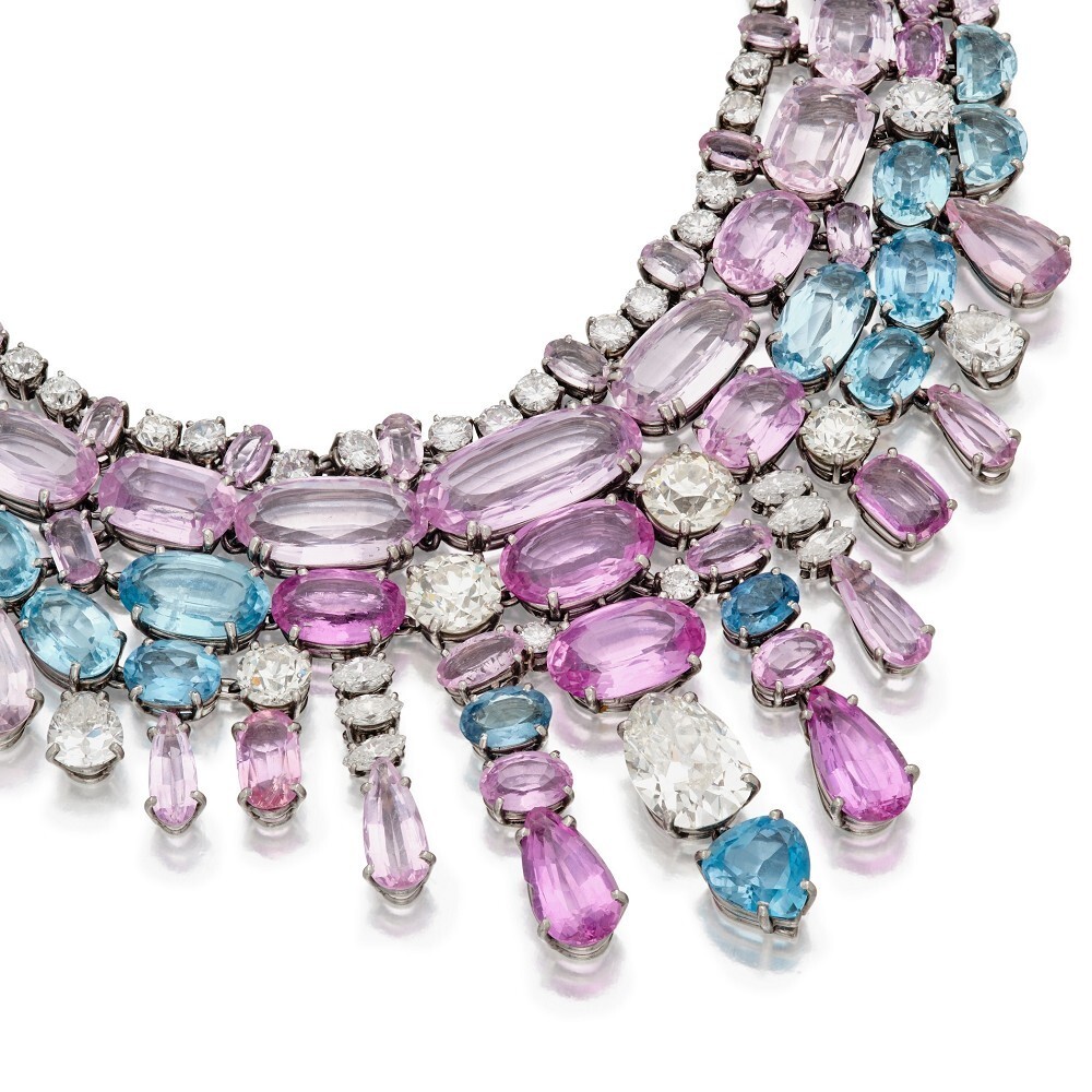 Сюзанна Бельперрон (1900-1983) — выдающийся ювелирный дизайнер XX века, чья смелость в исследовании материалов и стилей дизайна не знает границ. Легендарная фраза "Мой стиль – моя подпись" стала ее визитной карточкой, ведь она не ставила клеймо на своих творениях. На предстоящем аукционе будет представлено более 20 творений Бельперрон, среди которых особого внимания заслуживает колье, пленяющее сложной гармонией многорядности и искусным сочетанием розовых топазов, морганитов и аквамаринов. В этом колье отражается уникальное чувство цвета и геометрии, присущее гению дизайнера.