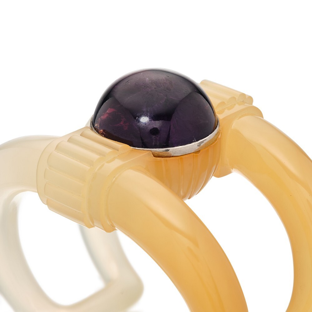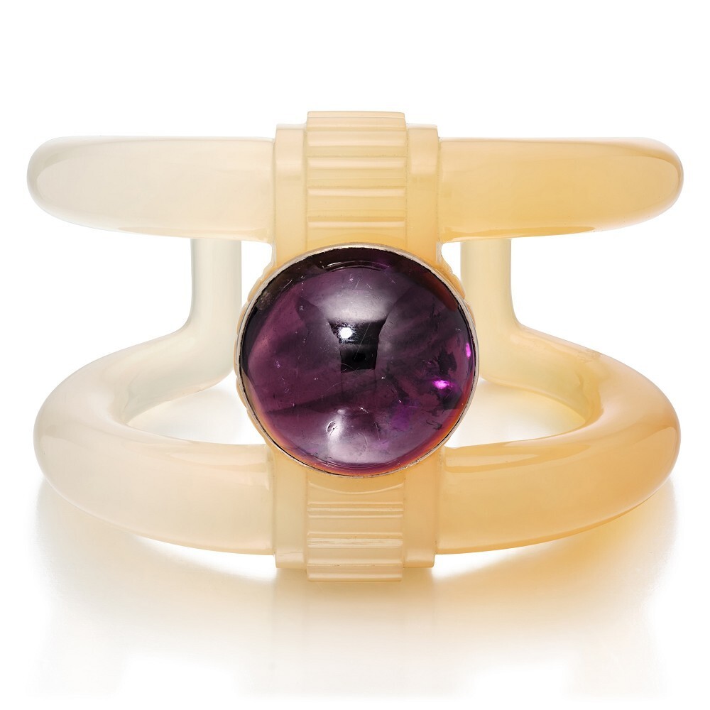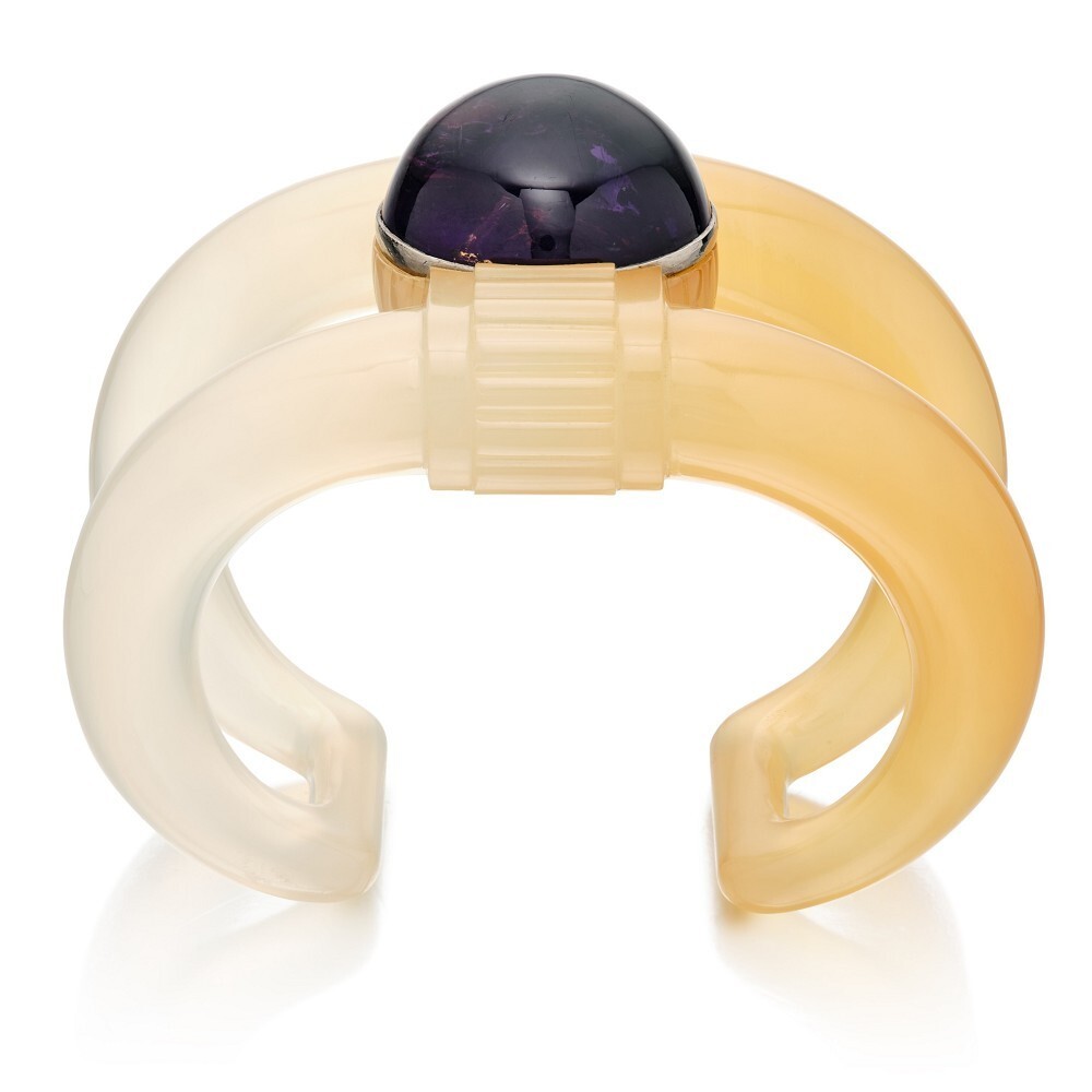 Другой шедевр – браслет, где два кварца образуют захватывающий дуэт: корпус, выточенный из двухцветного халцедона, и центральный камень, инкрустированный кабашоном аметиста. Единство их химического состава и поразительный контраст цвета и формы рождают глубокую философскую симфонию:
