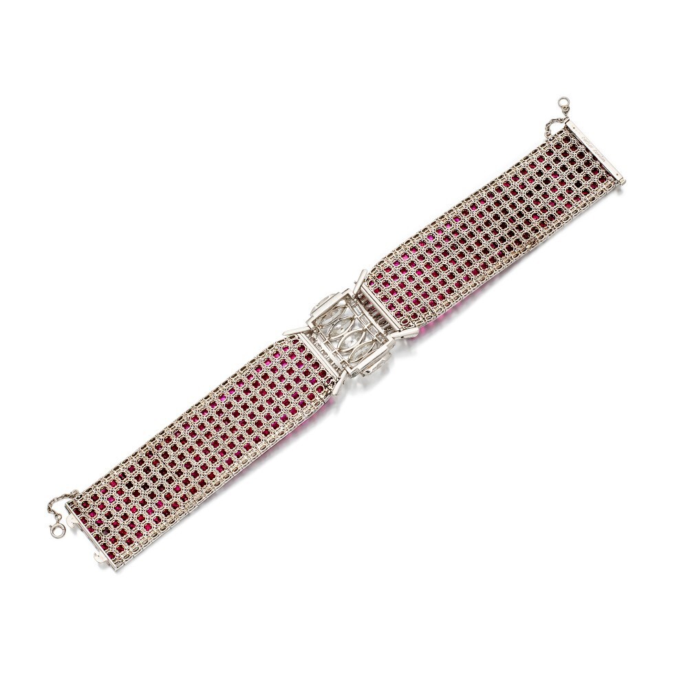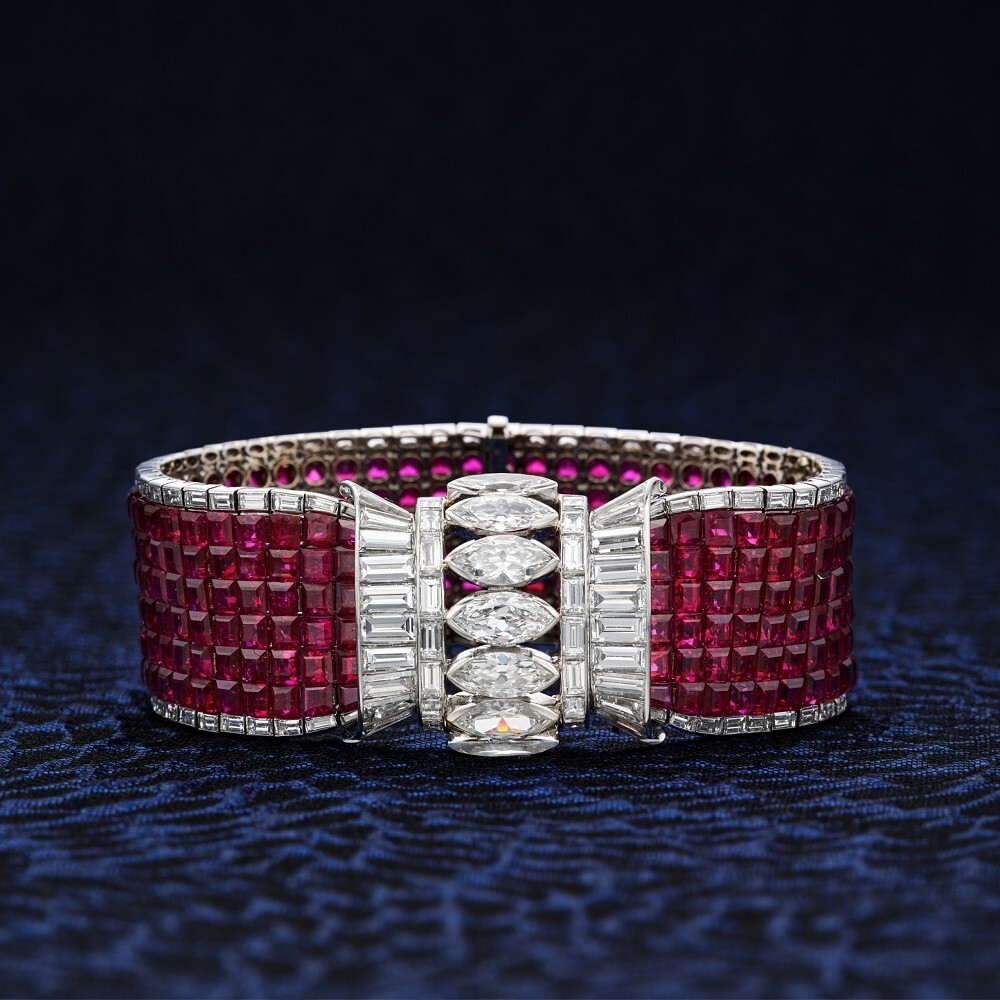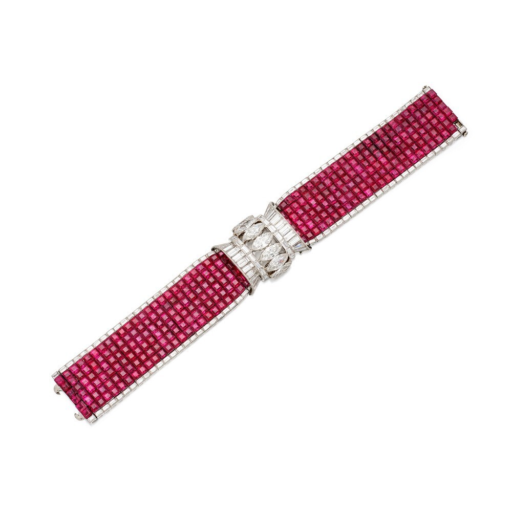 Также на распродаже представлен браслет Cartier с рубинами и бриллиантами 1930-х годов, в котором используется техника «невидимой закрепки», позволяющая устанавливать рубины индивидуальной огранки, не обнажая никаких зубцов. Этот вид закрепки Cartier использует крайне редко, что делает этот браслет весьма привлекательным для коллекционеров: