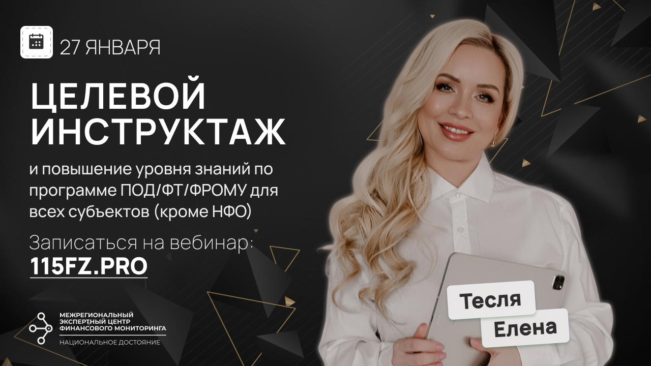 Спикер – Тесля (Пинигина) Елена, лауреат национальной премии «Преподаватель года по ПОД/ФТ» 2020, эксперт по ПОД/ФТ/ЭД/ФРОМУ с опытом работы 21 год, генеральный директор МЭЦФМ «Национальное достояние», главный редактор СМИ «ВЕСТИ 115-ФЗ».