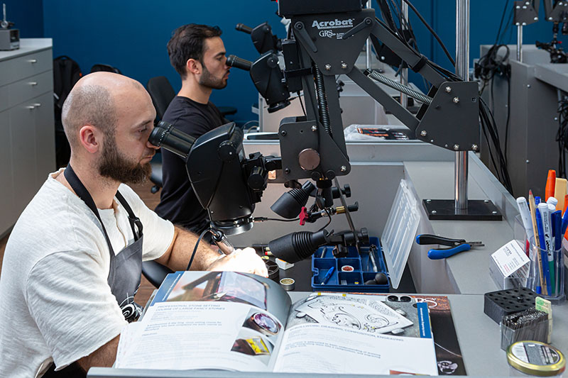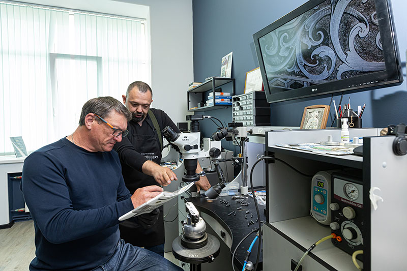 На уровне премиум-сегмента работа штихелем практически невозможна без микроскопа и пневматической гравировальной системы. Именно поэтому вход в направления «закрепка» и «гравировка» в школе построен вокруг этого навыка.