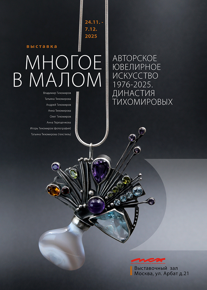 Выставка «Многое в малом» откроется 24 ноября в выставочном зале МСХ на Арбате. На ней будут представлены предметы авторского ювелирного искусства нескольких поколений династии Тихомировых.