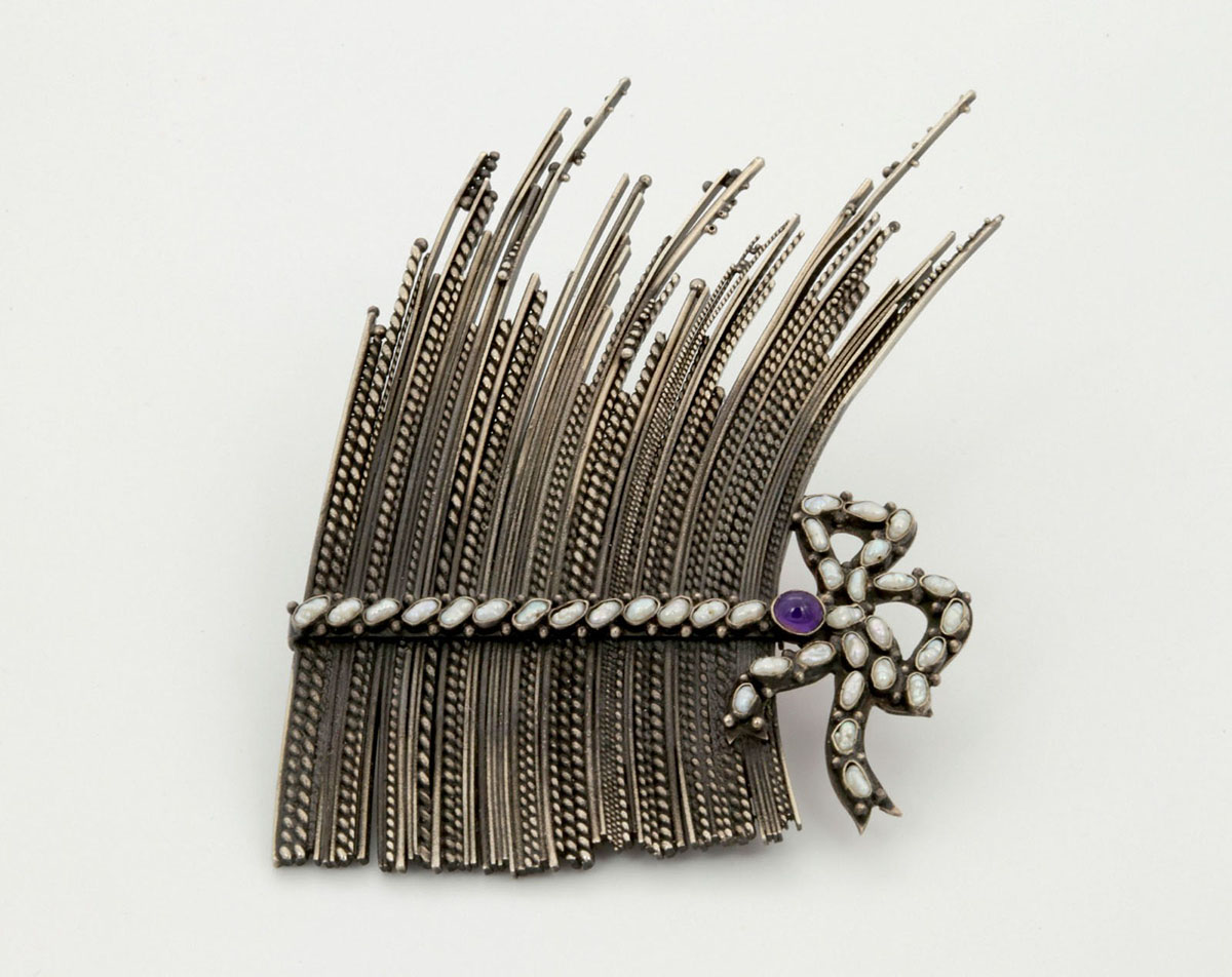 Металл, жемчуг, аметист. 93х68х8 мм