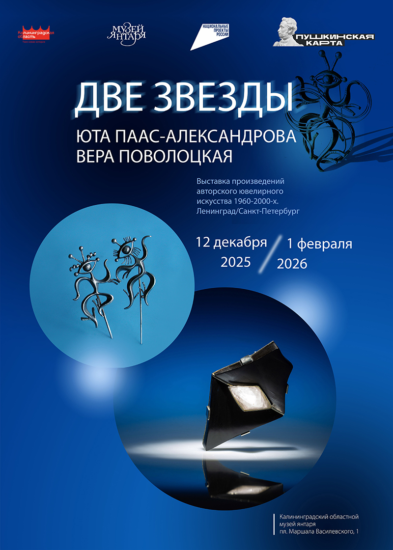 Юта Йоханнесовна Паас-Александрова (1927-2002) и Вера Георгиевна Поволоцкая (1932–2015) – ведущие фигуры ленинградского ювелирного искусства старшего поколения. Они заслуженно считаются основоположниками ленинградской ювелирной школы, наиболее мощными и яркими её фигурами. На выставке «Две звезды» можно будет увидеть их работы, созданные в период от с 1960-х до 2000-х годов. Кроме творческих работ и эскизов, в экспозиции представлены и серийные вещи, созданные по эскизам Веры Поволоцкой.