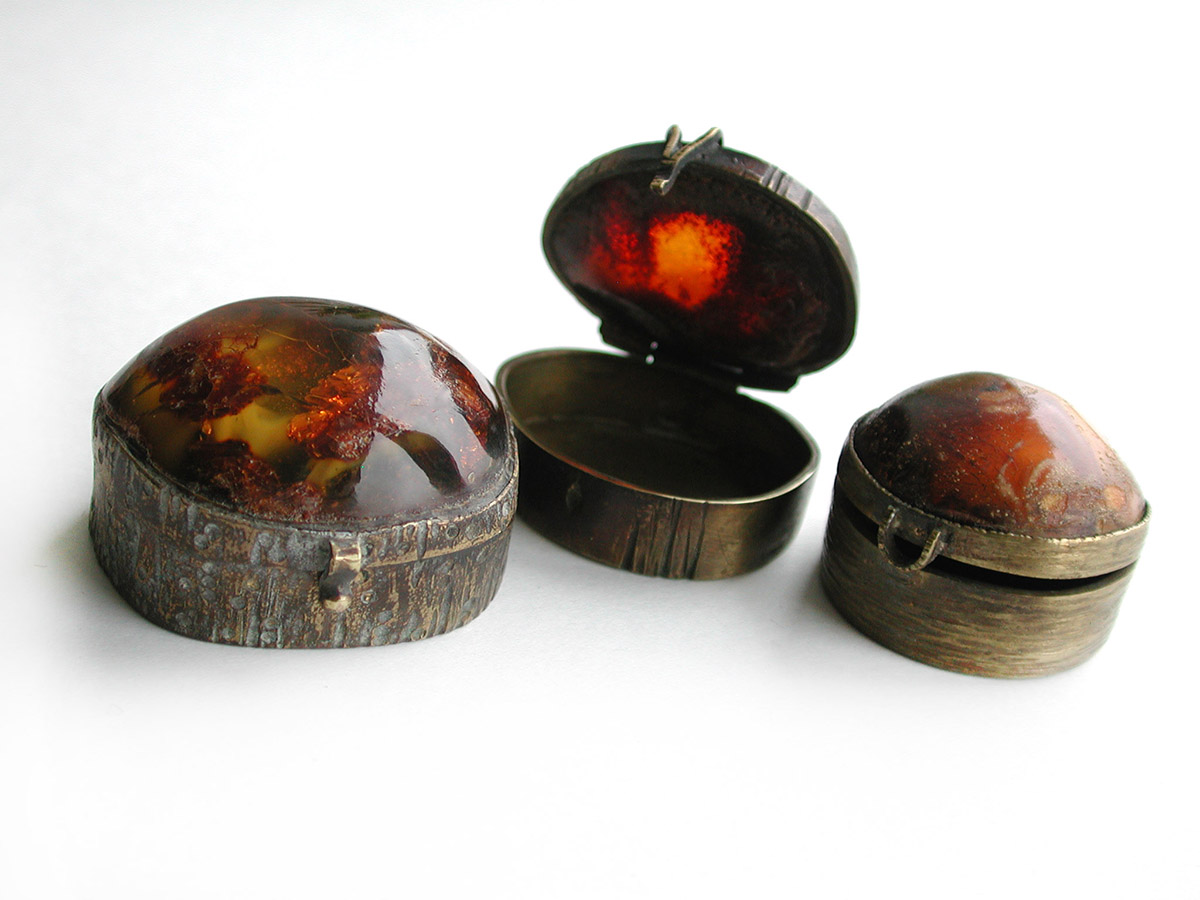 Особенно ярко различие стилей этих двух авторов можно наблюдать в их произведениях с янтарем. Юта Йоханнесовна очень любила этот камень, много с ним работала. Она пыталась подчеркнуть естественную красоту и индивидуальность каждого камня, оставляя и подчеркивая его природную форму. Идея, заложенная в янтаре самой природой, находила продолжение в металле. А в работах Веры Георгиевны янтарь обретает четкие геометрические формы. Его яркий золотистый цвет и прозрачность контрастируют с черным непрозрачным объемом гагата. По своей смелой ультрасовременной форме эти украшения ближе к авангардной скульптуре, чем к привычным украшениям.