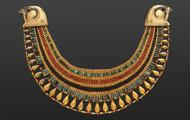 Широкий воротник Сенебтиси. Египет, гробница Сенусерта, конец – начало XIII в. (ок. 1850–1775 гг. до н. э.). Фаянс, золото, сердолик, бирюза. Головы соколов и подвески в виде листьев первоначально были изготовлены из позолоченного гипса, отреставрированы в позолоченном серебре. Глаза – изначально позолоченные бусины, отреставрированные в позолоченном гипсе.