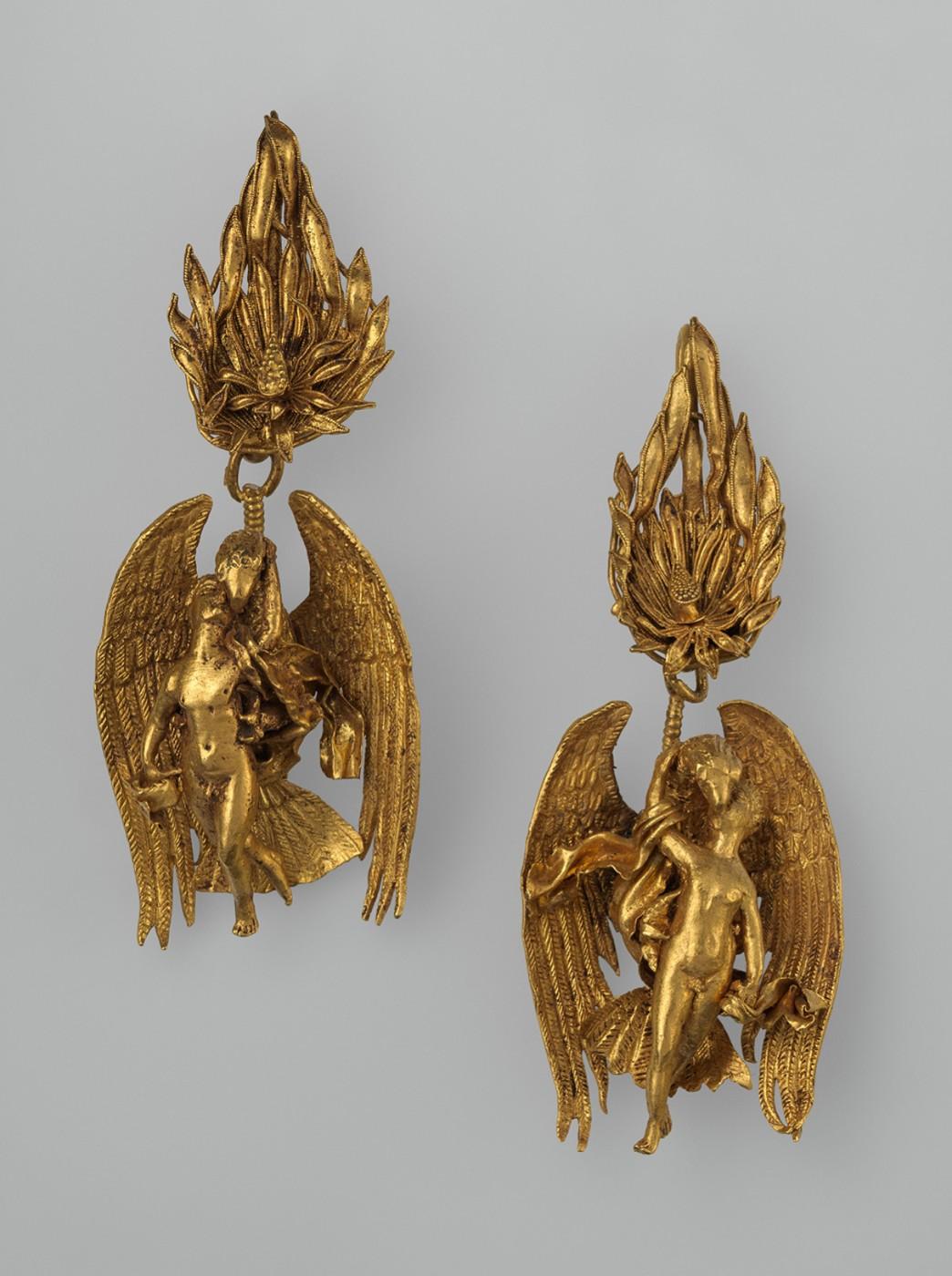 Пара золотых серег с Ганимедом и орлом. Эллинистический период, около 330–300 гг. до н.э. Золото, горный хрусталь, изумруд