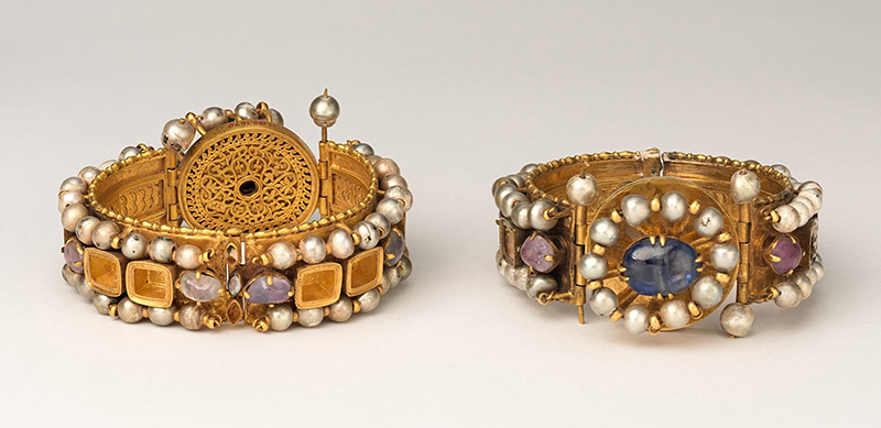 Браслеты с драгоценными камнями. Вероятно, Константинополь, 500–700 гг. Золото, серебро, жемчуг, аметист, сапфир, опал, стекло, кварц, изумрудная плазма.