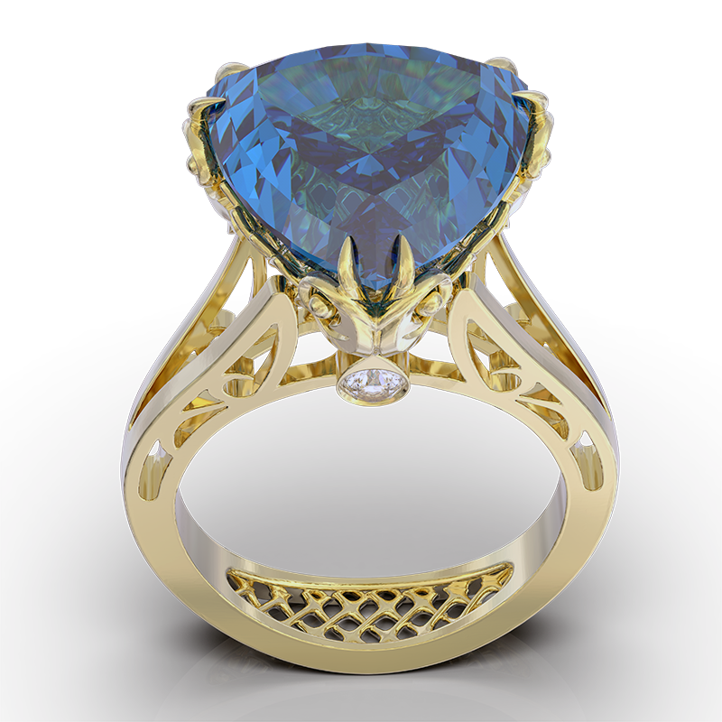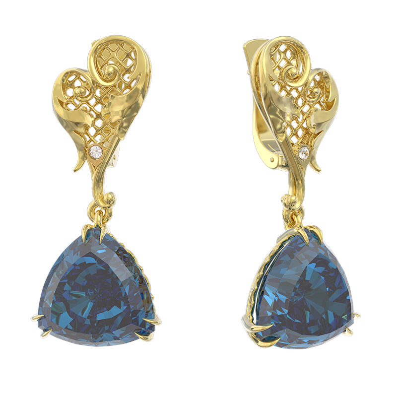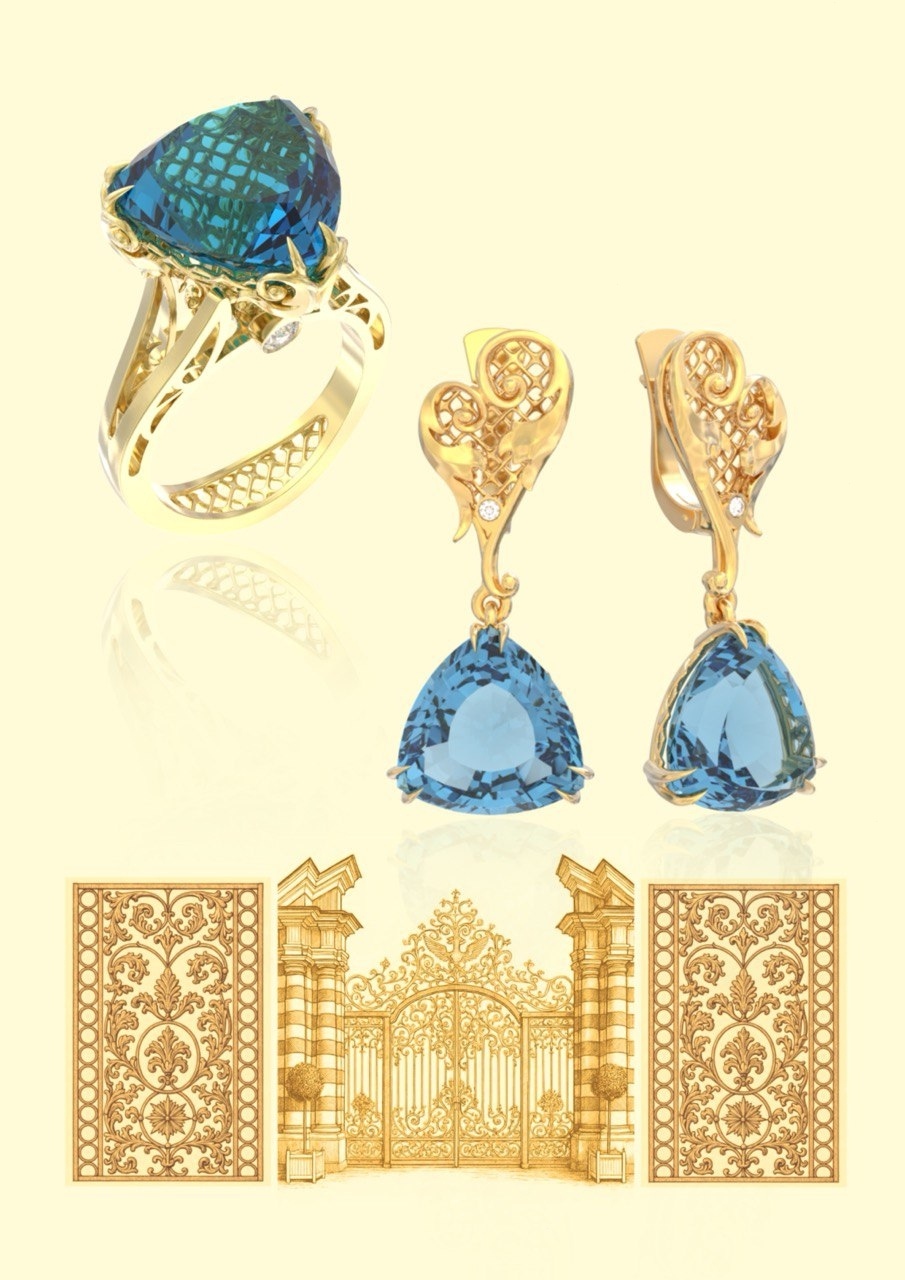 Изготовленный из благородного жёлтого золота 750 пробы, комплект демонстрирует филигранную технику исполнения: тончайшие завитки металла вторят резным деталям дворцовых интерьеров и изящным кованым оградам царскосельских садов. Центральным элементом композиции является глубокой синевы сапфир, символизирующий императорское величие и небесную гармонию. Камень искусно обрамлен ажурным плетением золотых нитей, образующих подобие короны. Эта конструкция, сочетая визуальную легкость с прочностью закрепки, обеспечивает оптимальную игру света, усиливая блеск сапфира. (Экспертное мнение: Подобная техника крепления драгоценных камней использовалась в ювелирном деле еще в XVIII веке).