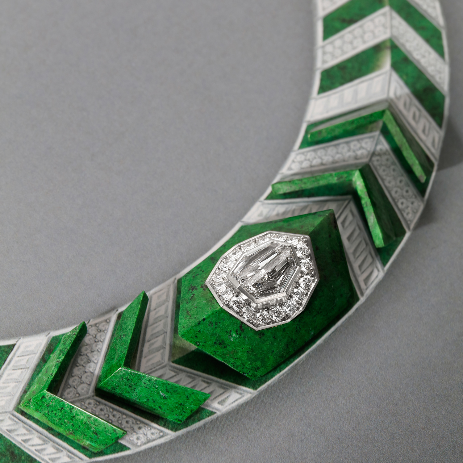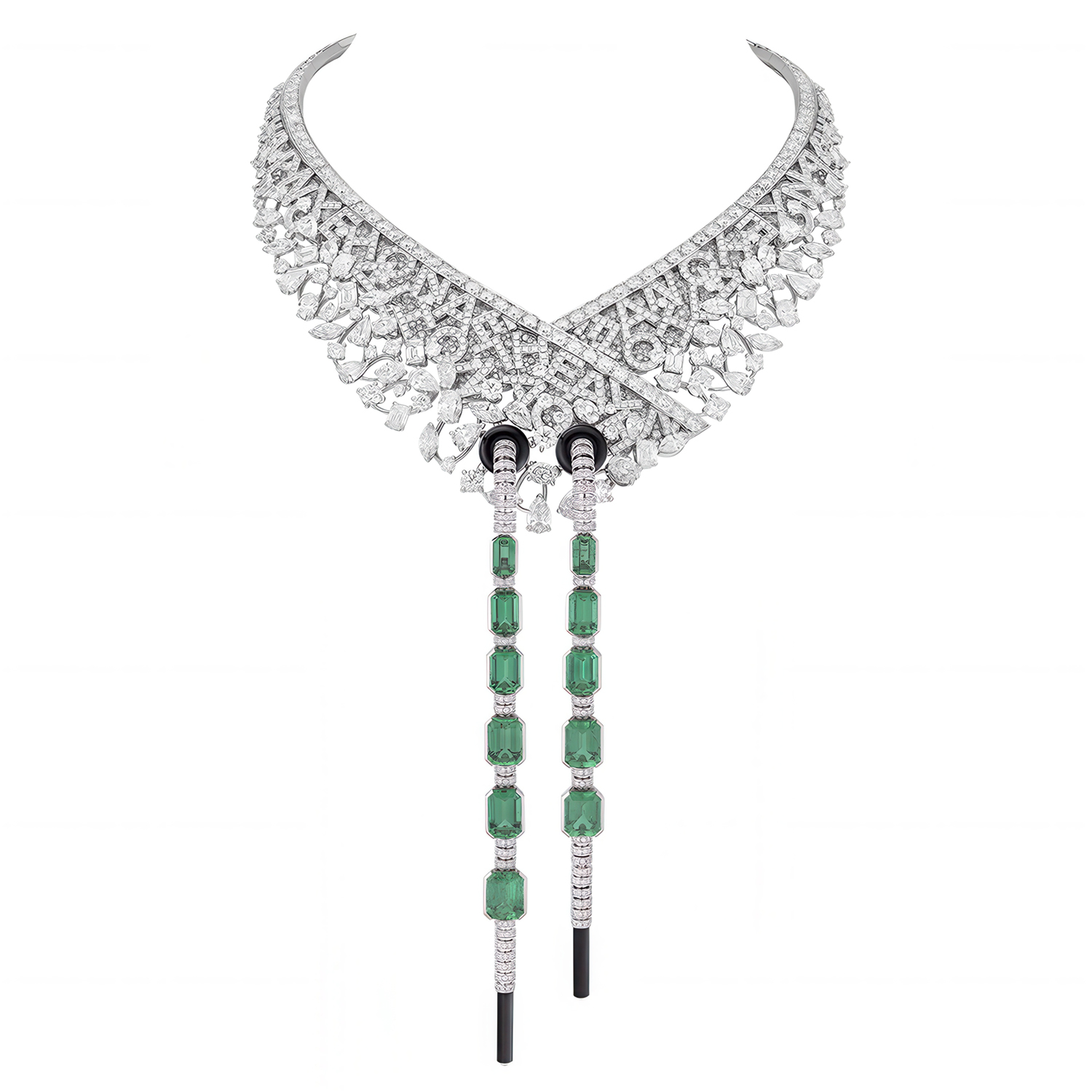 Ожерелье, отмеченное независимым жюри международных экспертов, изготовлено из 18-каратного белого золота, платины, бриллиантов, оникса, 11 изумрудов изумрудной огранки общим весом 37,18 карата.