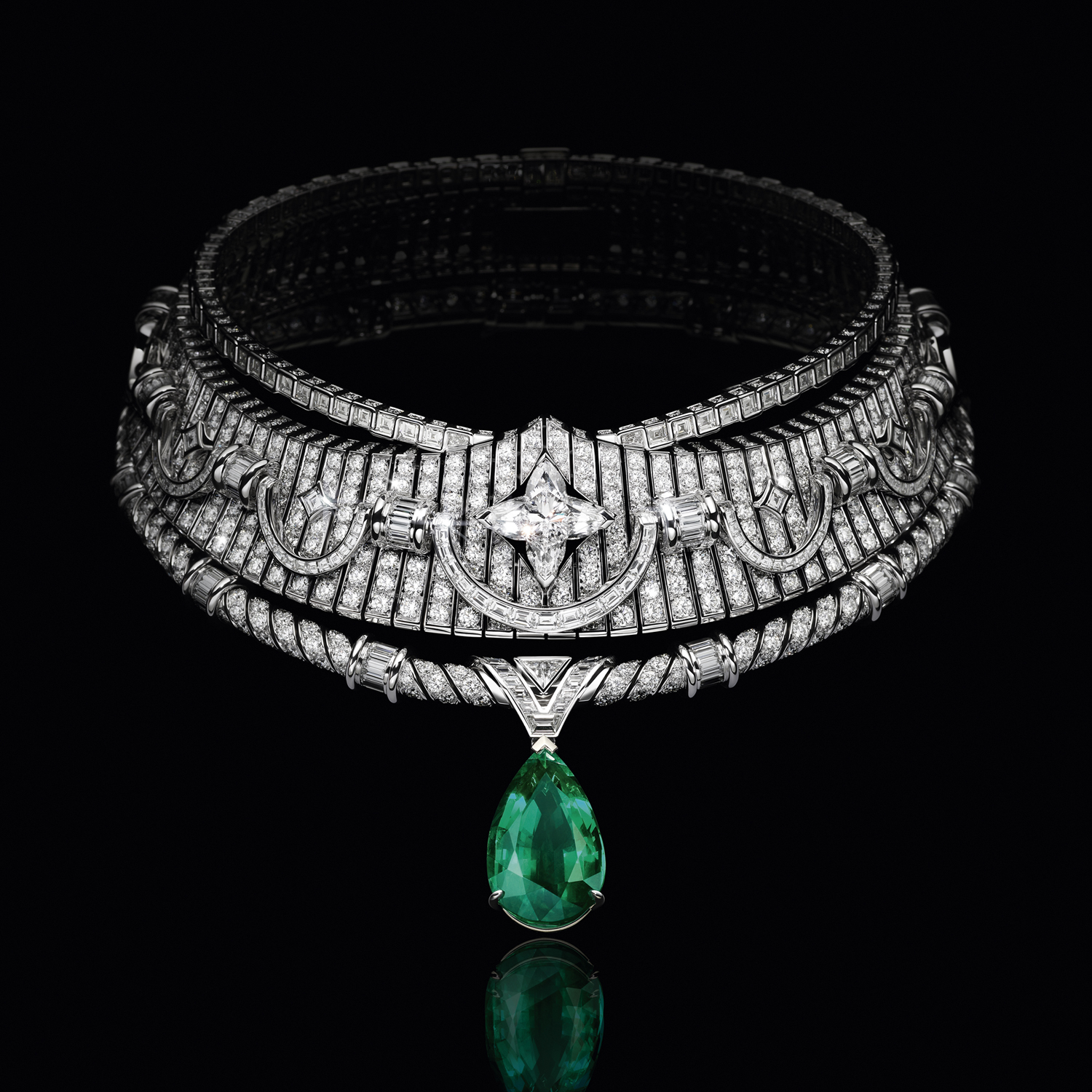 Apogée – это превосходное воплощение современного высокого ювелирного искусства. Его решительная женственность, подчеркнутая бриллиантами, воплощает все каноны Louis-Vuitton », – заявляет бренд. Колье украшено бриллиантом D Flawless LV Monogram Star огранки весом 10,56 карата «редкой чистоты » и «чрезвычайно редким и впечатляющим бразильским изумрудом грушевидной формы весом 30,75 карата » .