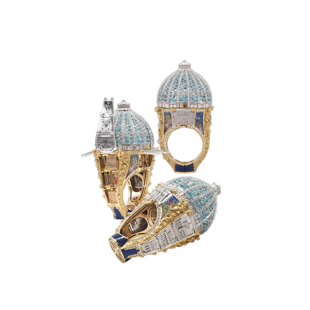 Алессио Боски со своим юбилейным кольцом стал победителем в первой категории. Кольцо посвящено католическому Святому году, символизирующему духовное обновление, преданность и примирение. Его семь богато украшенных дверей напоминают главные базилики Рима и их священные реликвии. Сочетая раннехристианское и ренессансное художественное наследие, изделие украшено изображением церкви Святого Илии, египетской синей эмалью, четырьмя добродетелями в персидской миниатюре и микромозаикой купола собора Святого Петра. Миниатюрная Сфера Силы отражает вечное господство Христа, передавая единство, мир и любовь.