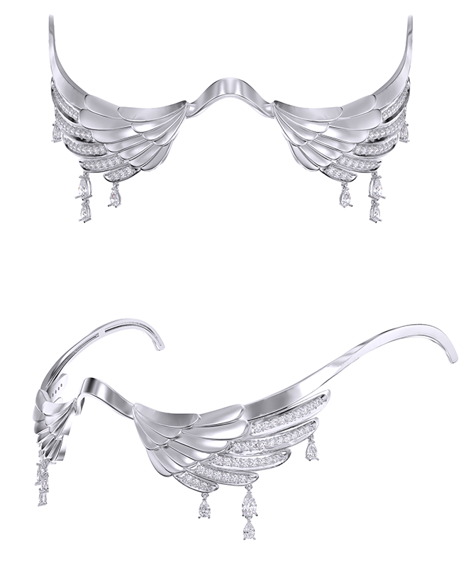 Латунная маска для лица с покрытием родием и кристаллами Swarovski. Работа, вдохновленная библейскими и ангельскими образами, реконцептуализирует ювелирное изделие как объект перформативного искусства, превращая владельца в живой холст. Скульптурность формы, сложная детализация и зеркальная полировка демонстрируют авторскую способность синтезировать повествование, символизм и авангардный дизайн.