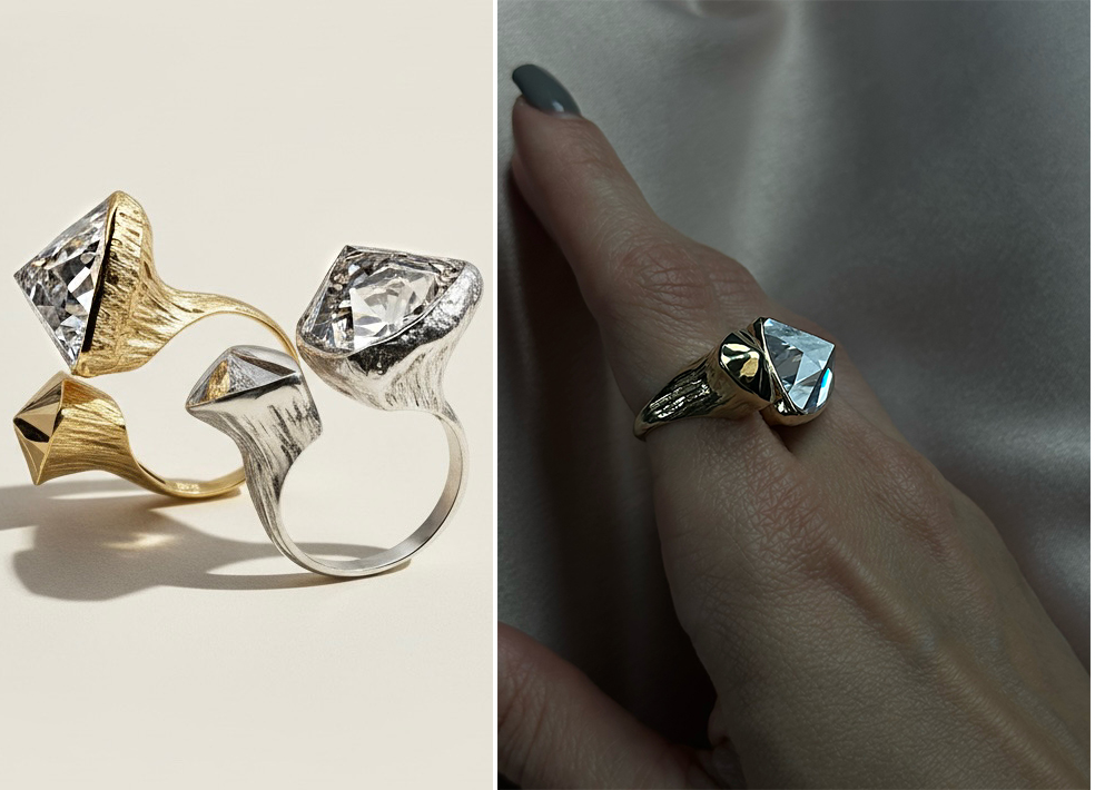 Кольцо из серебра 925 пробы с позолотой 14 карат, увенчанное кристаллом огранки «бриолет», символизирующим чистоту и стойкость. Две вершины библейской горы интерпретированы в виде скульптурных, современных форм. Работа олицетворяет силу, элегантность и духовное наследие Армении, превращая величественный образ в лаконичное произведение носимого искусства.