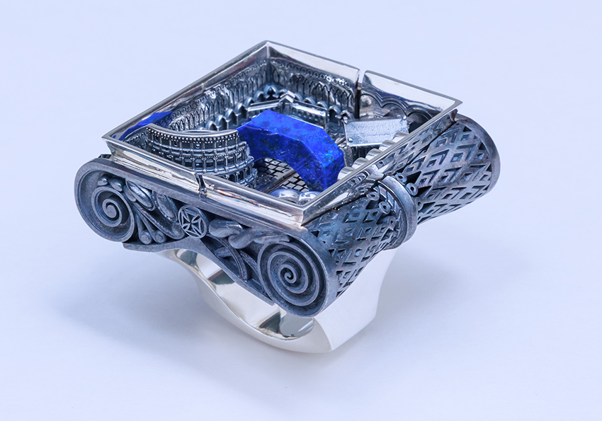 Кольцо из серебра 925 пробы с натуральным лазуритом, являющееся гимном историческим и культурным связям между Арменией и Италией. В дизайне интегрированы узнаваемые архитектурные элементы: храм Гарни, фонтаны площади Республики в Ереване и мост Риальто в Венеции. Центральный лазуритовый камень формирует символический мост, объединяющий две нации через общее наследие и филигранное мастерство.