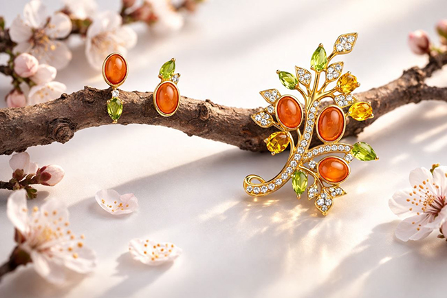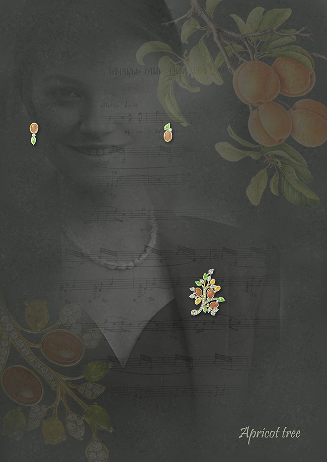 Трансформируемая брошь-подвеска из золота 750 пробы, инкрустированная гелиолитом, цитрином и перидотом. Вдохновленная армянским абрикосовым деревом и музыкальной поэмой Комитаса «Цырани цар» («Абрикосовое дерево»), работа воплощает жизненную силу и культурную память. Инновационным элементом является интеграция NFC-чипа, позволяющего воспроизвести фрагмент произведения Комитаса, что создает уникальный мультисенсорный опыт.