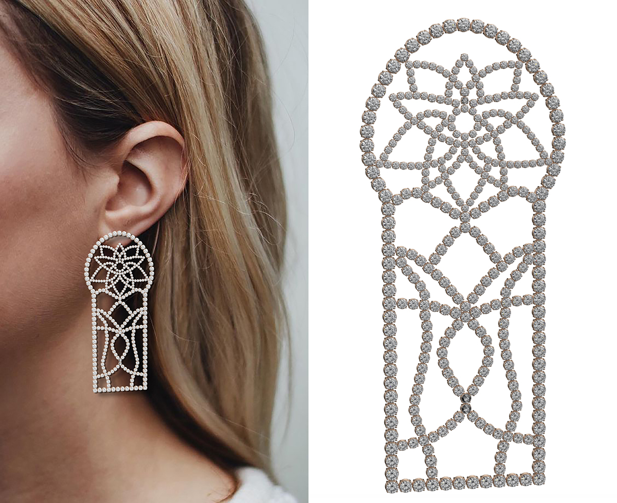 Серьга из 18-каратного желтого золота с инкрустацией бриллиантами в технике «паве». Работа визуализирует диалог между Востоком и Западом посредством ажурных архитектурных силуэтов, отсылающих к армянским пейзажам и средиземноморским мотивам. Розетка в верхней части трактуется как символ рода, памяти и женской силы, превращая украшение в элегантный культурный мост.