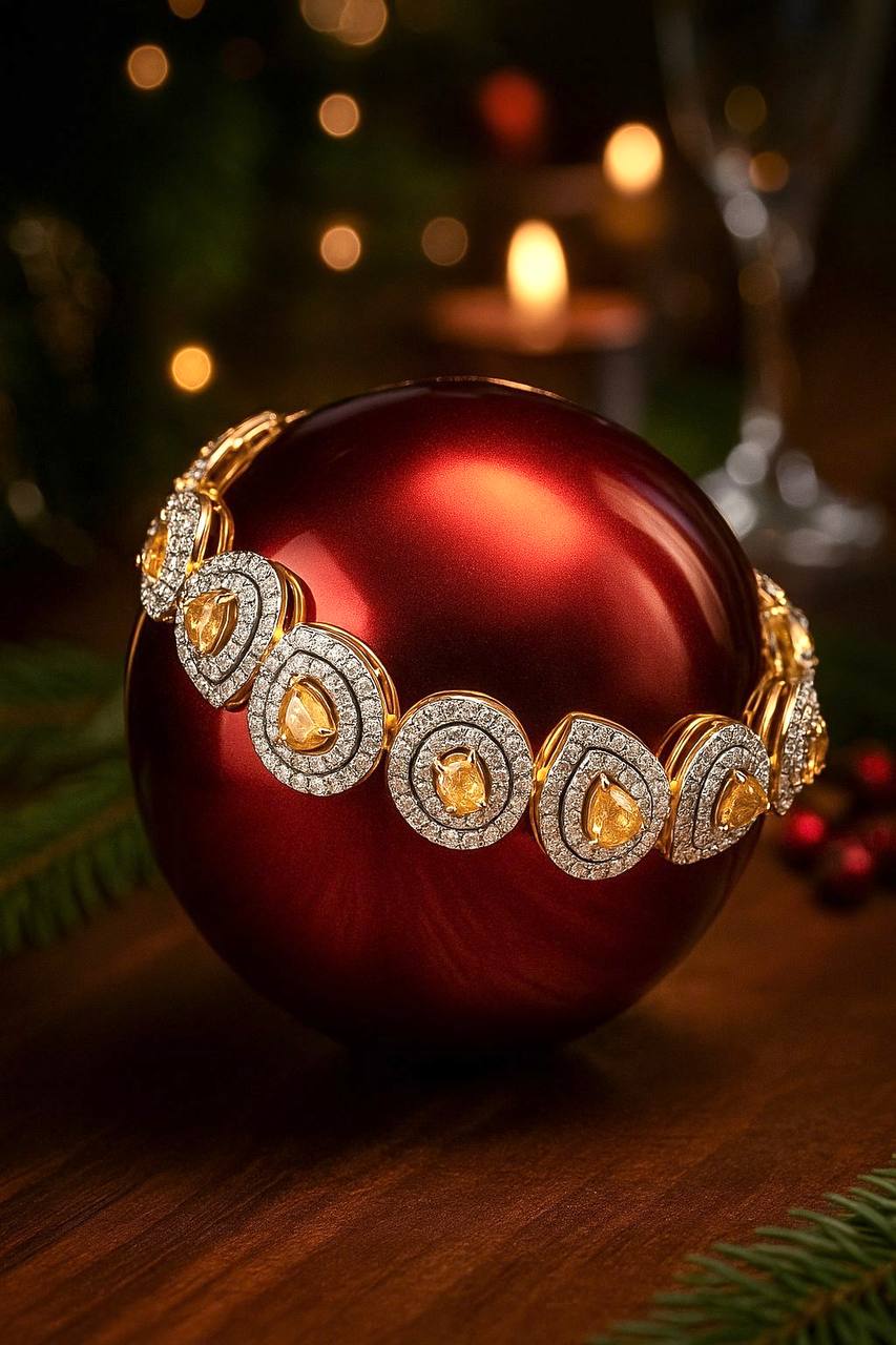 Это не просто браслет — это капля летнего света на запястье. Теплое желтое золото мягко обнимает кожу, а в его сердцах горят редкие оранжевые бриллианты, будто крошечные закаты, пойманные в ловушку роскоши.