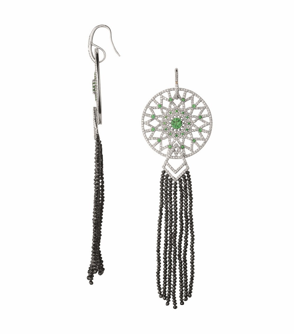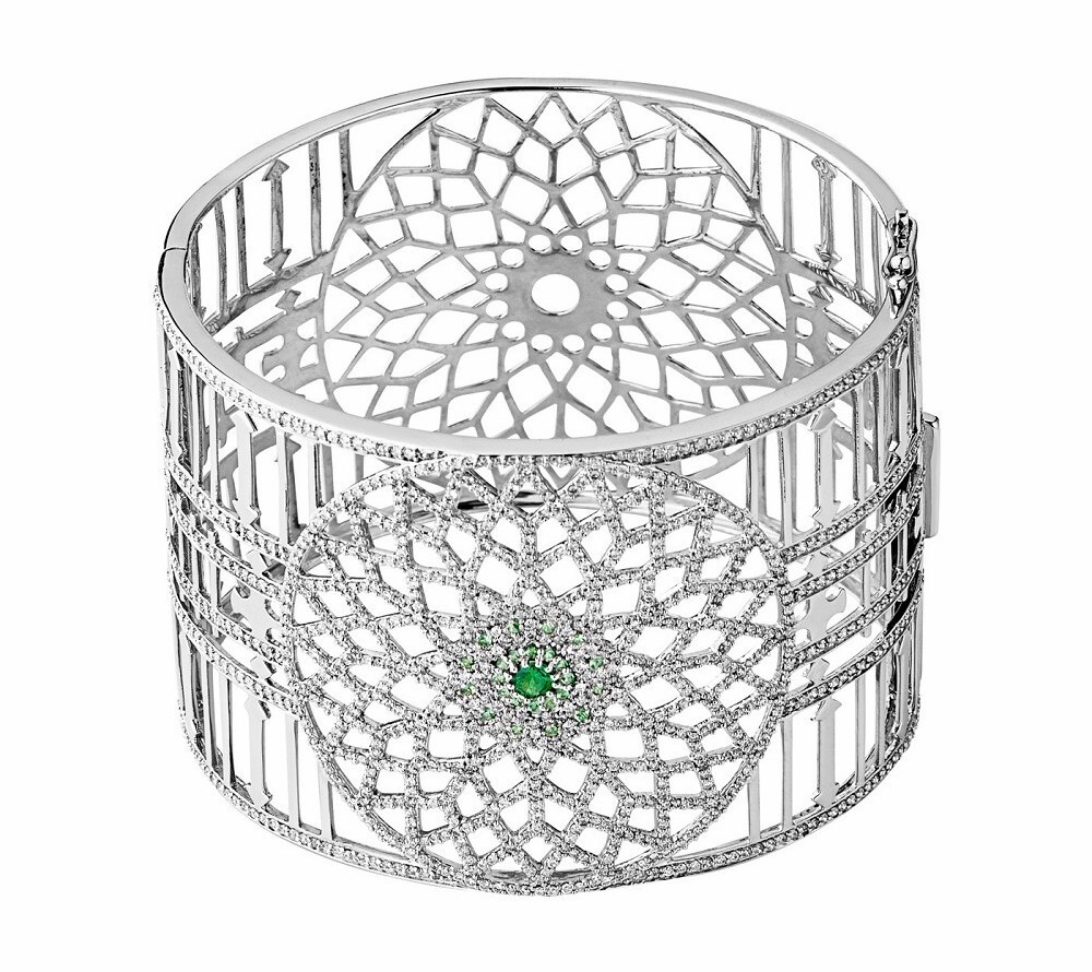 Циферблат Биг‑Бена, выполненный Огастесом Пьюджином, украшен центральным цветочным геометрическим узором из 312 отдельных панелей из опалесцирующего стекла. Опираясь на эту симметричную форму, Links of London применила тонкие линии для очерчивания изысканных лепестков и инкрустировала их яркими камнями цаворита: каждый диск украшён 25 камнями, символизирующими 25‑летний юбилей бренда.