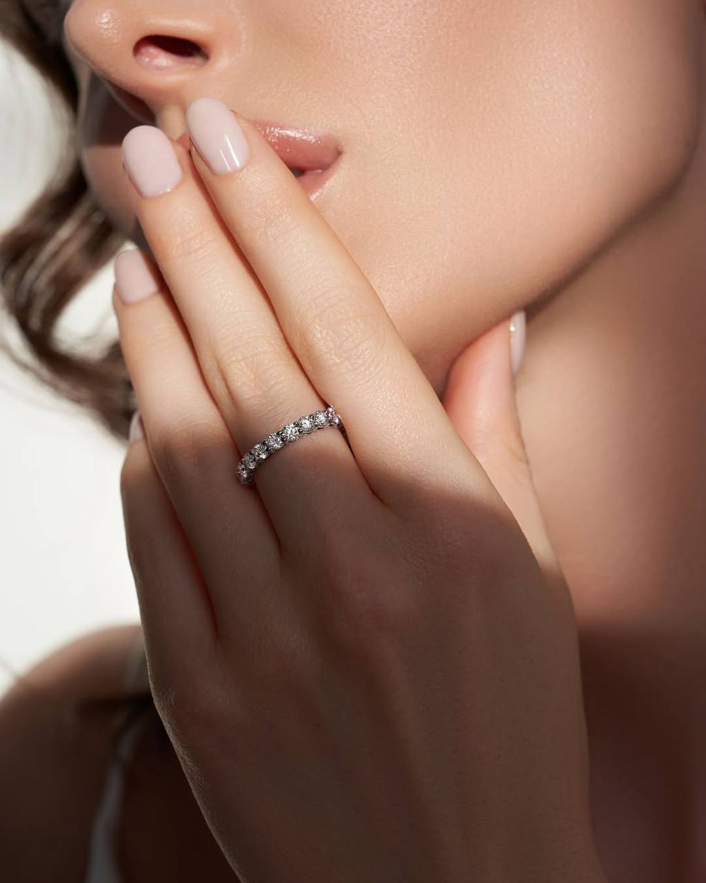 Каждый камень — лабораторный бриллиант премиального качества, закреплённый так, чтобы свет свободно проникал сквозь грани и отражался сотнями бликов. Дизайн выполнен в формате full eternity, где сияние сопровождает вас по всей окружности кольца.