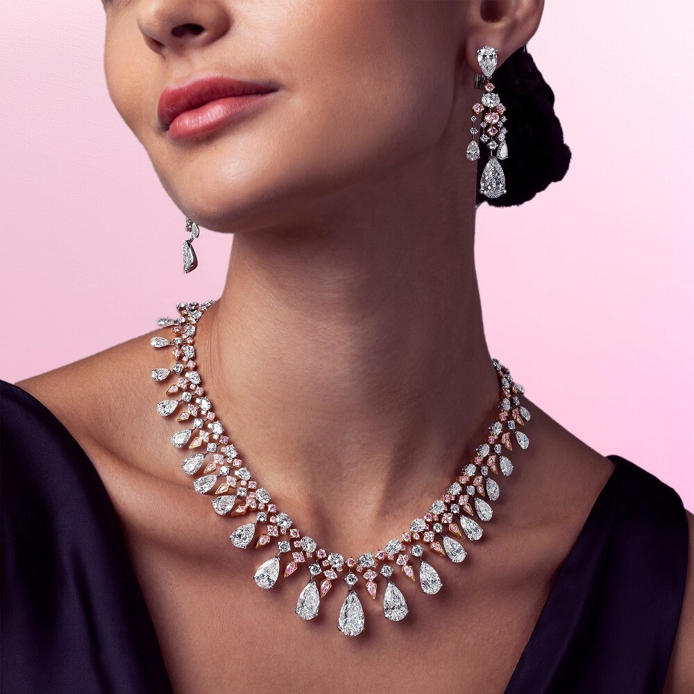 Например, колье Harmonia украшено крупными бесцветными бриллиантами грушевидной формы, расположенными в шахматном порядке, и мелкими овальными пурпурно-розовыми бриллиантами, создающими гармоничный и яркий цветовой ритм.