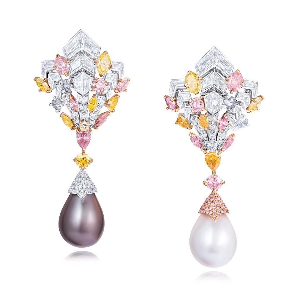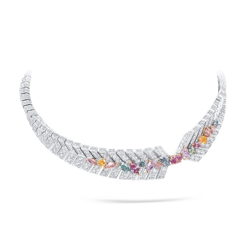 Среди изделий с цветными бриллиантами наиболее ярким является колье Fearne, выполненное из белого золота и инкрустированное бесцветными бриллиантами, создающими листья папоротника с естественными изгибами. Семнадцать цветных бриллиантов, разбросанных по стеблям, становятся ярким акцентом — от ярко-синих и зеленых бриллиантов до высококачественных пурпурно-розовых и желто-оранжевых бриллиантов, создающих эффект бриллиантовой радуги вокруг шеи.