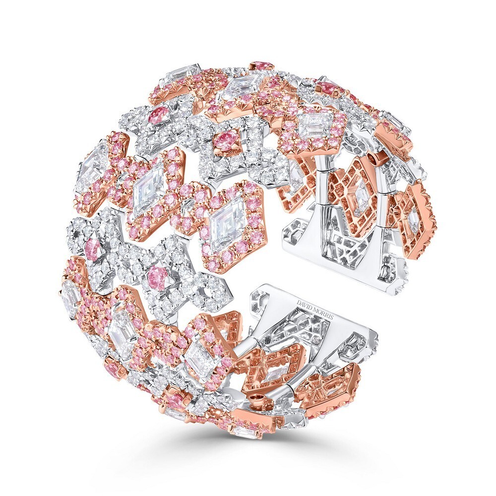 Браслет Prisma, в свою очередь, использует ромбовидный элемент дизайна, чередуя пурпурно-розовые и бесцветные бриллианты, что создает поразительный контраст между яркими розовыми и чистыми белыми тонами.