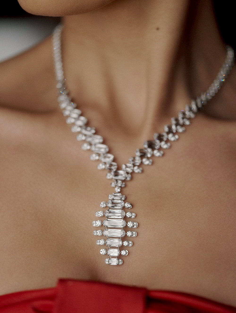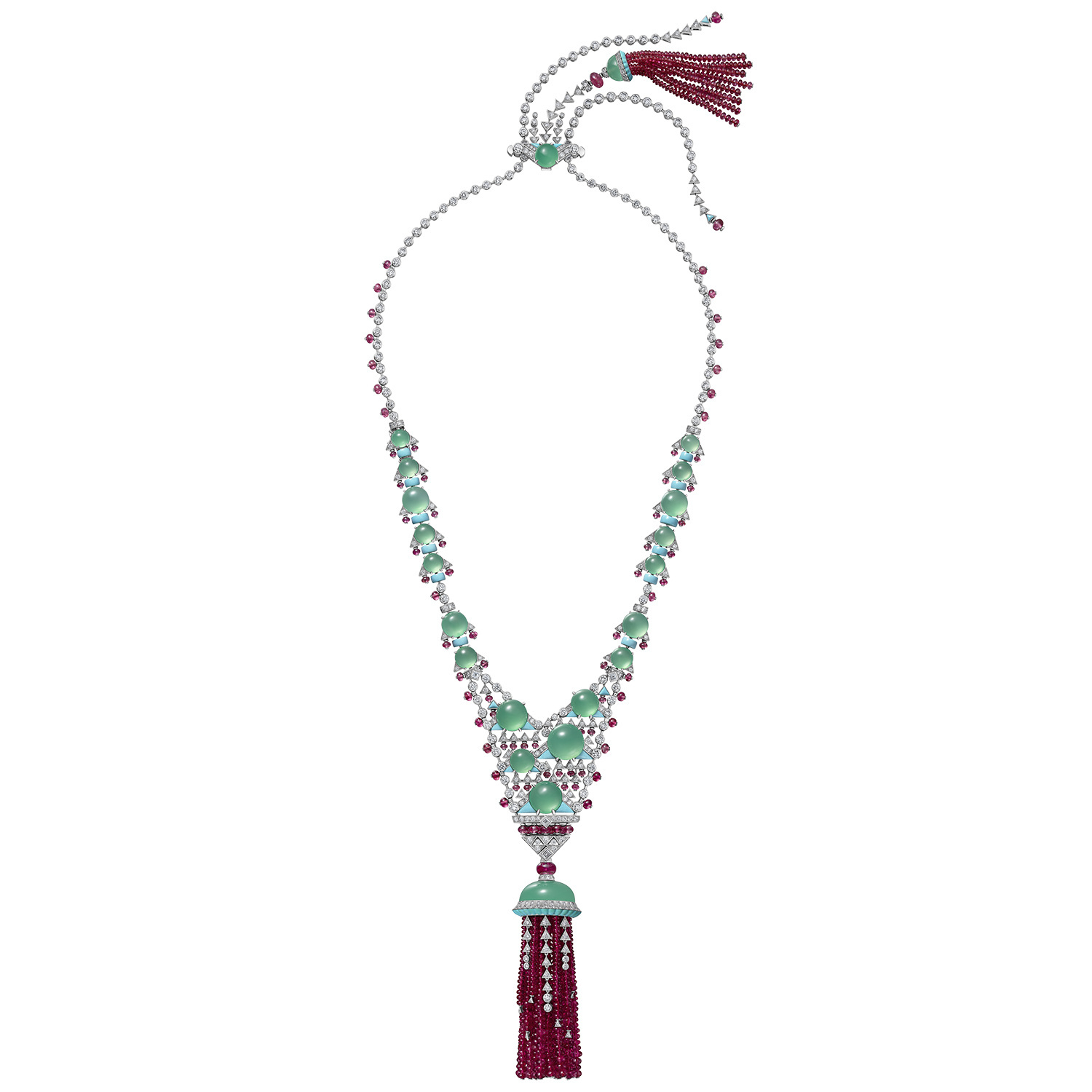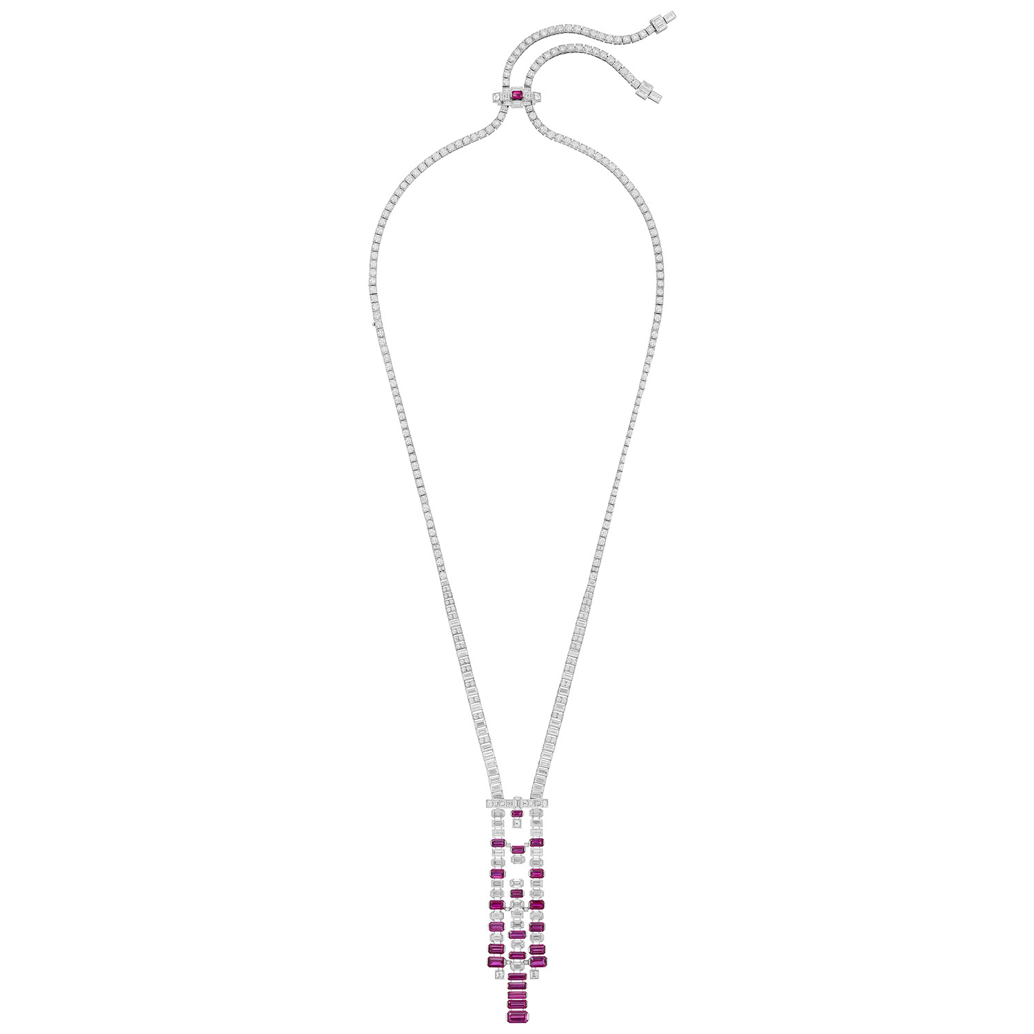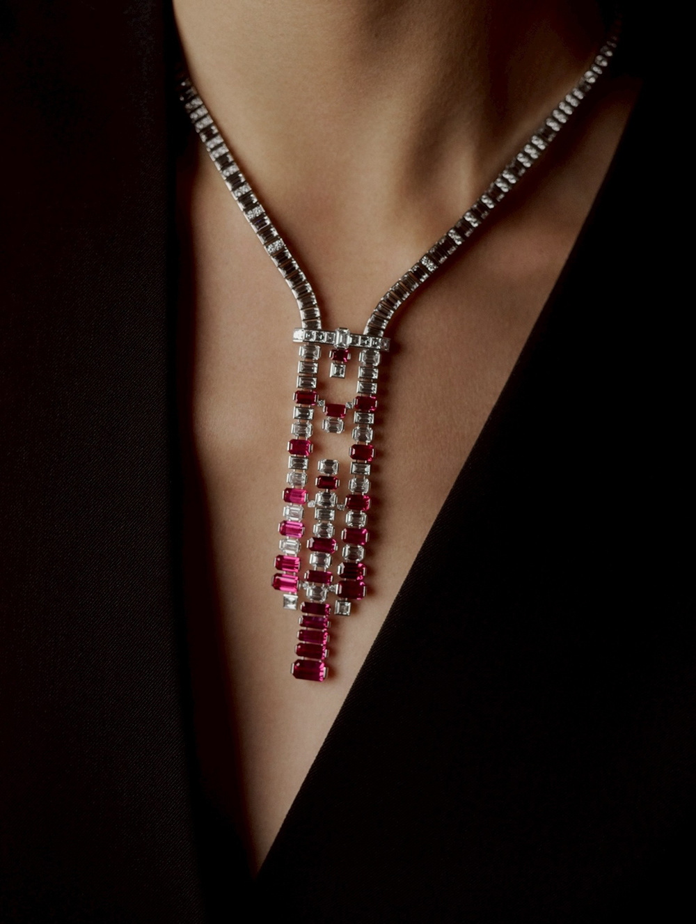 Платиновое колье Euphonia отдает дань стилю ар-деко, используя платину с круглыми, прямоугольными, квадратными и восьмиугольными бриллиантами для создания идеально симметричной цепочки и геометрического кулона. Рубины изумрудной огранки вкраплены по всей длине, создавая цветовой контраст. Самое оригинальное — кулон имеет два ажурных элемента в центре, позволяющих коже просвечивать, что придает изделию мягкий, женственный вид.