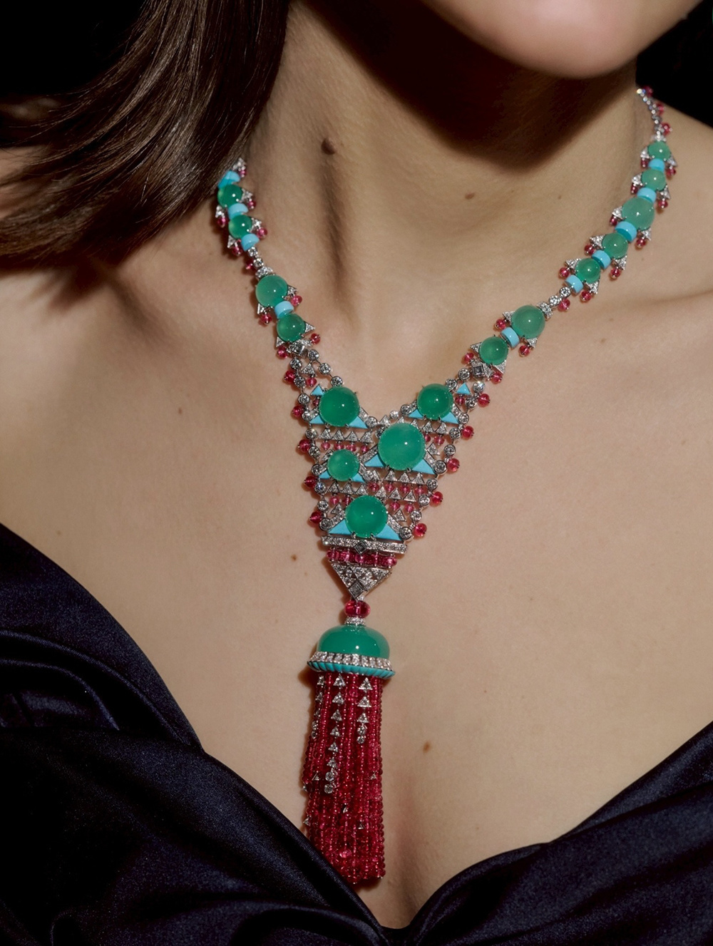 Колье Ondora из белого золота украшено подвесками-кисточками спереди и сзади, вдохновленными свободно плавающими в море медузами. Дизайнер использовал хризопраз огранки кабошон в сочетании с бриллиантами и бирюзой для создания зонтикообразного тела медузы, а свисающие внизу бусины из шпинели символизируют щупальца, демонстрируя тонкий баланс между натурализмом и стилизованными техниками. Колье украшено чередующимися бусинами из хризопраза и шпинели, напоминающими медузу, плавающую в море, а также классическую модель !тутти фрутти" от Cartier.