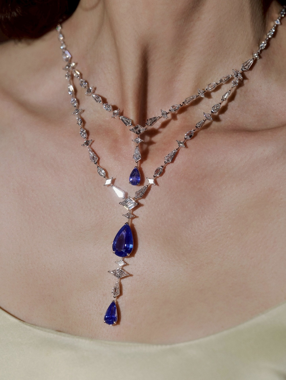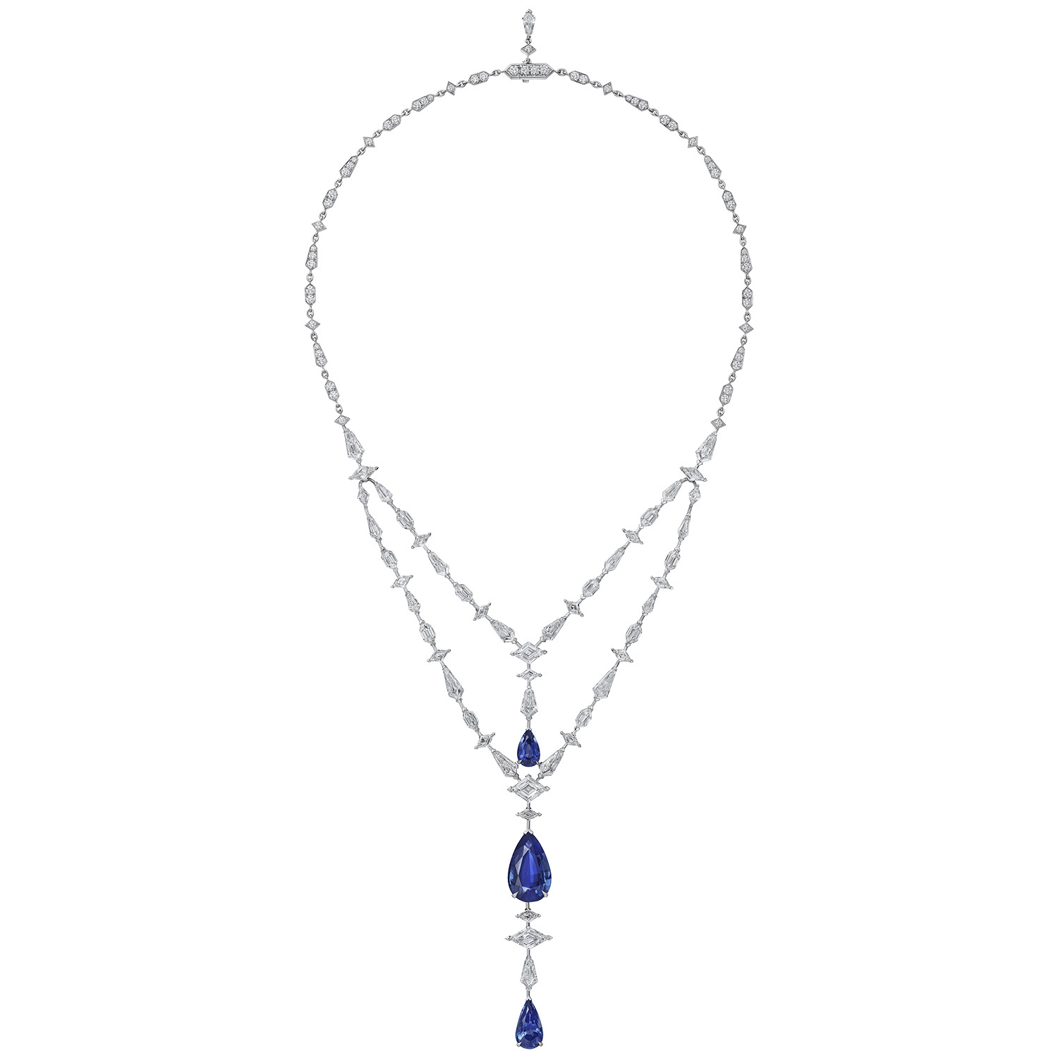 Эстетическая сущность платинового колье Parcae заключается в двойственном сочетании формы и цвета — три грушевидных мадагаскарских сапфира общим весом 16,59 карата вертикально пронизывают двойную V-образную бриллиантовую линию, их размер и насыщенный цвет создают визуальный фокус колье. Бриллиантовая линия состоит из бриллиантов огранки «воздушный змей», ромбовидных, шестиугольных и круглых бриллиантов разного размера, создавая живой и четкий геометрический ритм.