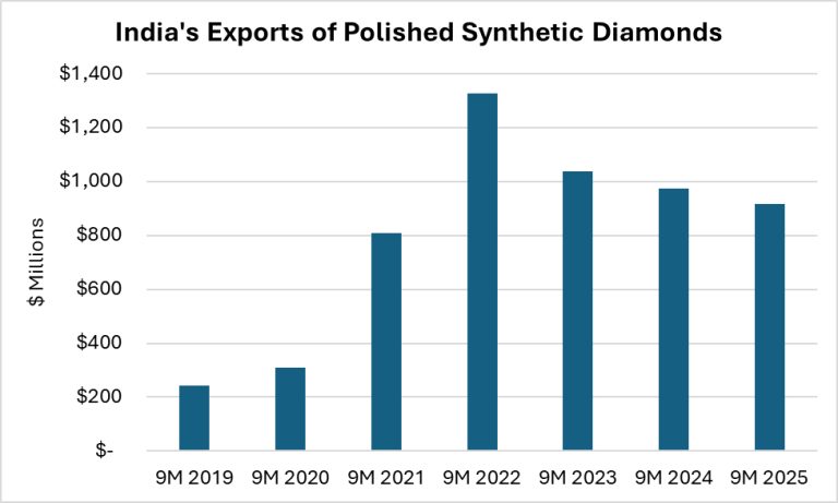 Тем временем стоимость выращенных в лаборатории алмазов продолжает падать на фоне растущего предложения. Согласно данным, опубликованным GJEPC, экспорт полированных синтетических алмазов из Индии за первые девять месяцев 2025 года года снизился на 6% до 916 миллионов долларов.