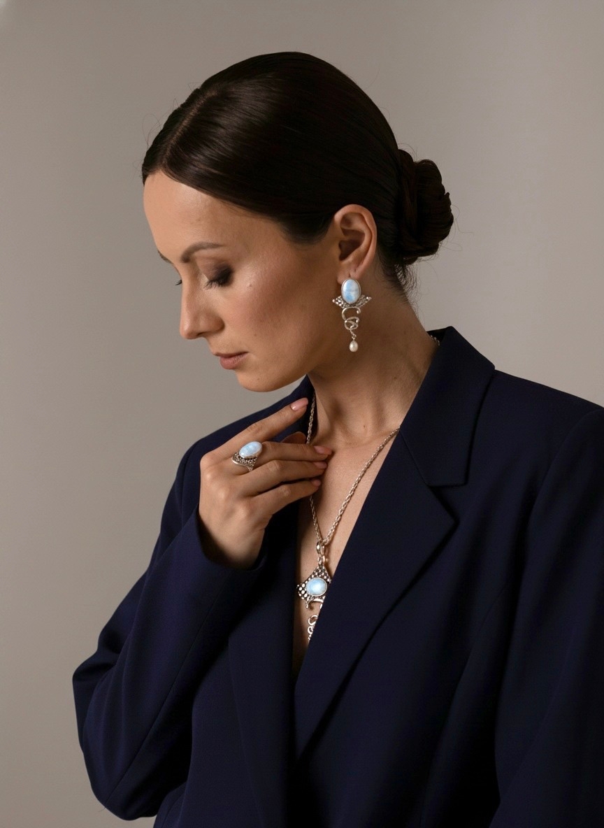 У камня есть эффект «адуляресценции» - голубовато-белое сияние, которое переливается при движении. Серебро не спорит с ним, а подчёркивает: холодный блеск металла + таинственный свет камня = идеальный дуэт.