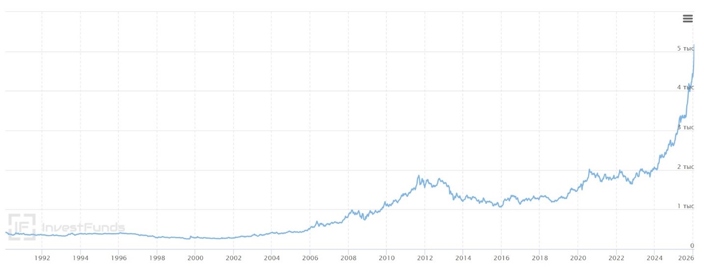 Но с началом СВО, а позднее - с приходом к власти Трампа, стабильность в мировой геополитике ушла, золото начало стремительно расти в цене, особенно набрав скорость роста с началом ведения Трампом тарифных войн и заявлениями по Гренландии. В итоге с октября 2023 года, все набирая скорость роста, золото за 2 года и 3 месяца с 1900 $/тр. унцию взлетело до отметки, превысившей 5400 $/тр. унцию, подорожав в 2,8 раза.