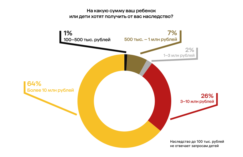 Если конвертировать запросы детей на наследство в деньги, то ситуация складывается следующая: абсолютное большинство родителей (64%) посчитало, что их чадо просит активы на сумму более 10 миллионов рублей, 26% –– от 3 000 000 до 10 000 000 рублей, 7% –– от 500 000 до 1 000 000 рублей, 2% –– от 1 000 000 до 3 000 000 рублей. Только 1% детей хотят получить имущество на сумму до полумиллиона, а наследство дешевле 100 000 рублей современные дети совершенно не рассматривают.