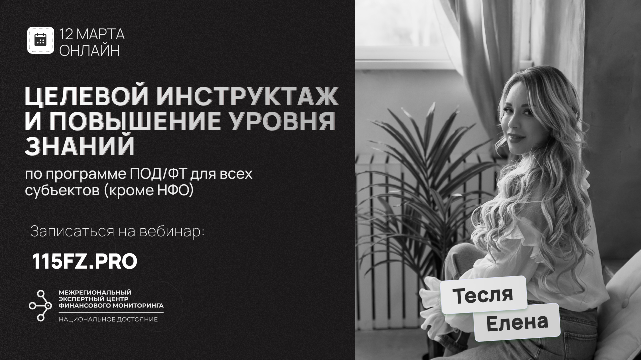 Спикер – Тесля (Пинигина) Елена, лауреат национальной премии «Преподаватель года по ПОД/ФТ» 2020, эксперт по ПОД/ФТ/ЭД/ФРОМУ с опытом работы 21 год, генеральный директор МЭЦФМ «Национальное достояние», главный редактор СМИ «ВЕСТИ 115-ФЗ».